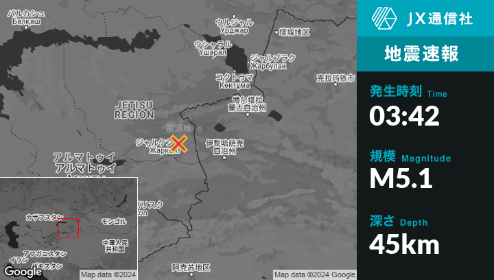 | 震源地 | カザフスタンのZharkentから北西21kmの地点 |
