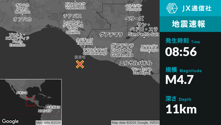 11月26日 08:56頃、グアテマラのOcósから南南西92kmの地点でM4.7の地震がありました。