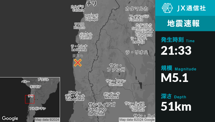 11月26日 21:33頃、チリのOvalleから北西22kmの地点でM5.1の地震がありました。