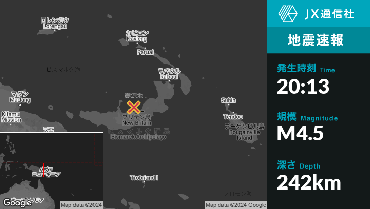 | 震源地 | パプアニューギニアのKimbeから東北東68kmの地点 |