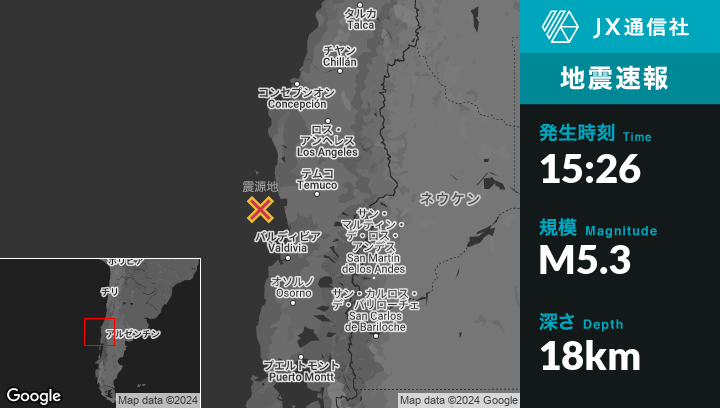 12月07日 15:26頃、チリのCarahueから西南西64kmの地点でM5.3の地震がありました。