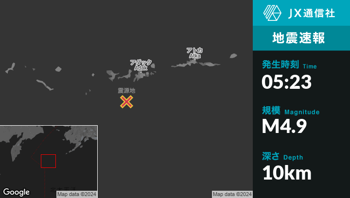 12月09日 05:23頃、アラスカのAdakから南南西96kmの地点でM4.9の地震がありました。