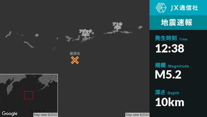 12月09日 12:38頃、アラスカのAdakから南南西129kmの地点でM5.2の地震がありました。