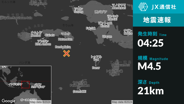 | 震源地 | インドネシアのMasohiから南東215kmの地点 |