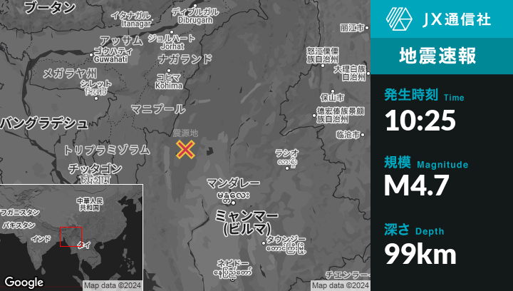 | 震源地 | ミャンマーのMawlaikから東南東23kmの地点 |