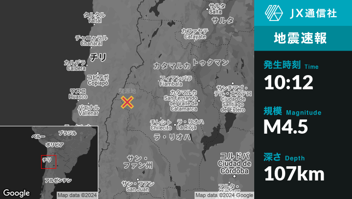 12月12日 10:12頃、アルゼンチンのVinchinaから西北西88kmの地点でM4.5の地震がありました。