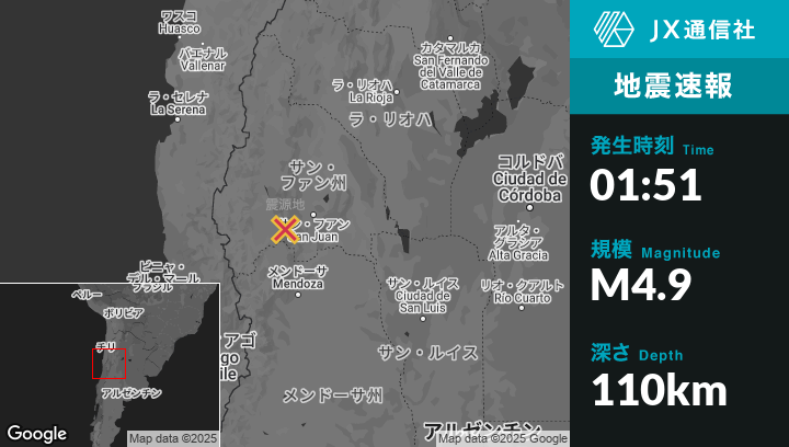 | 震源地 | アルゼンチンのVilla Basilio Nievasから西南西37kmの地点 |