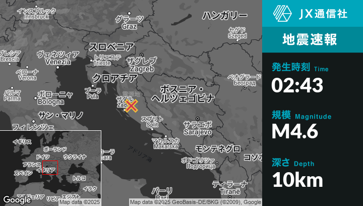 2月12日 02:43頃、クロアチアのStarigradから北東7kmの地点でM4.6の地震がありました。