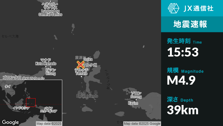 | 震源地 | インドネシアのTobeloから西78kmの地点 |