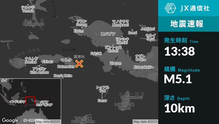 | 震源地 | インドネシアのFakfakから西南西145kmの地点 |