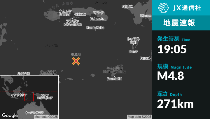 2月19日 19:05頃、東ティモールのLospalosから北東252kmの地点でM4.8の地震がありました。