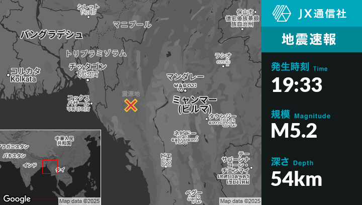 | 震源地 | ミャンマーのHakhaから南129kmの地点 |