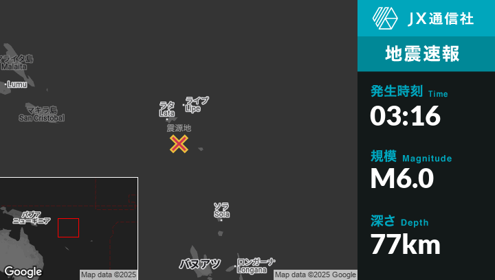 2月24日 03:16頃、ソロモン諸島のLataから南南東84kmの地点でM6.0の地震がありました。