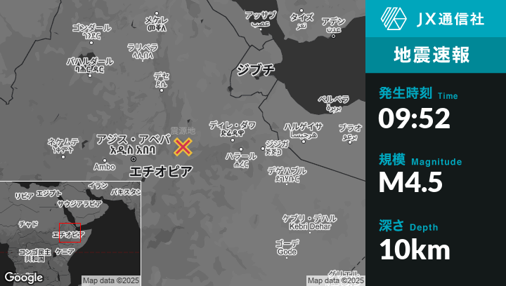 2月24日 09:52頃、エチオピアのĀwashから北北東61kmの地点でM4.5の地震がありました。