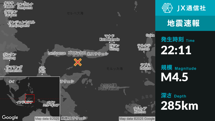 | 震源地 | インドネシアのGorontaloから南西77kmの地点 |