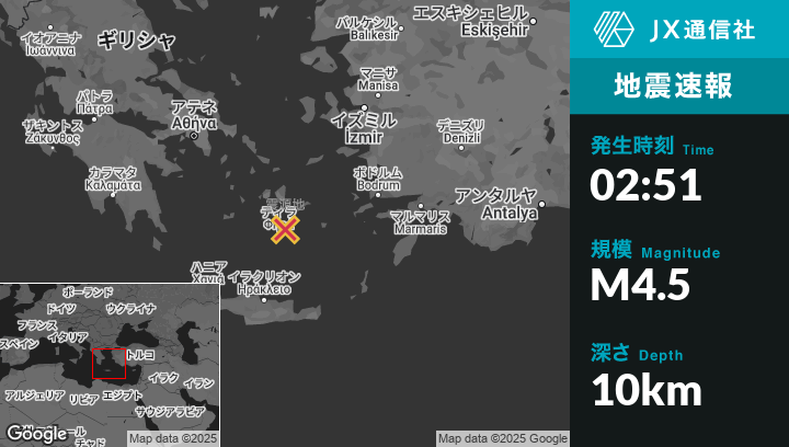 3月28日 02:51頃、ギリシャのOíaから北東20kmの地点でM4.5の地震がありました。
