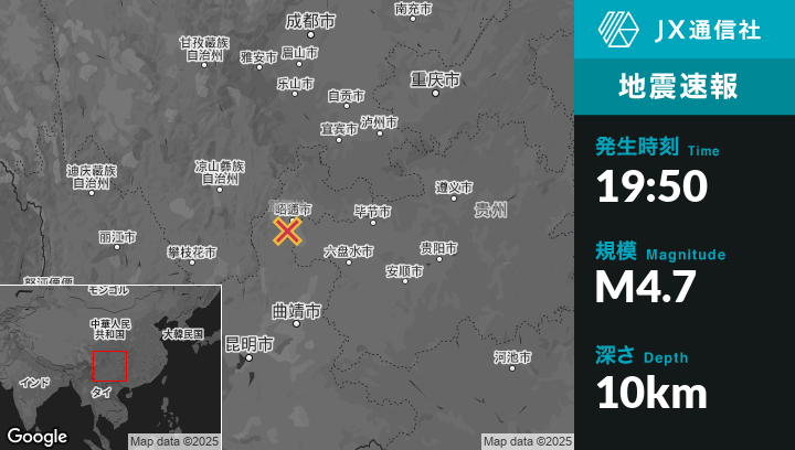 | 震源地 | 中国のZhaotongから南西12kmの地点 |