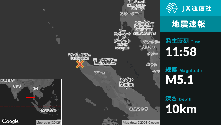 3月30日 11:58頃、インドネシアのBanda Acehから南12kmの地点でM5.1の地震がありました。