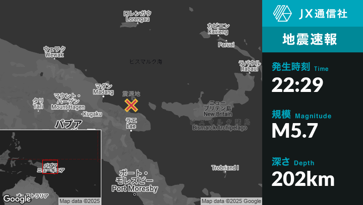 4月22日 22:29頃、パプアニューギニアのLaeから北137kmの地点でM5.7の地震がありました。