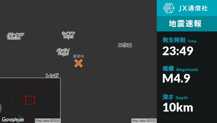 4月22日 23:49頃、トンガのFangale’oungaから東南東122kmの地点でM4.9の地震がありました。