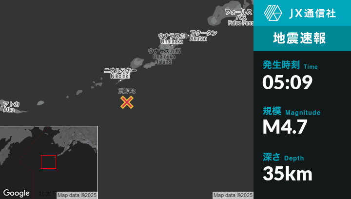 4月28日 05:09頃、アラスカのNikolskiから南南東60kmの地点でM4.7の地震がありました。
