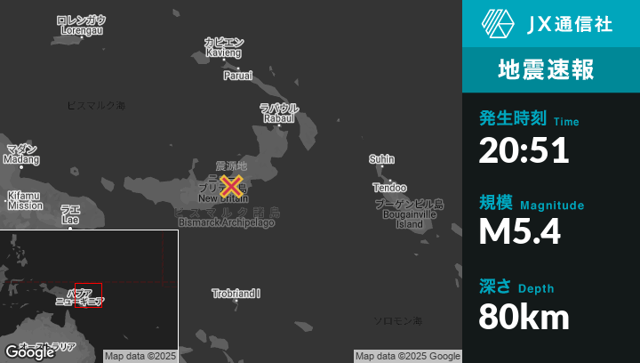 | 震源地 | パプアニューギニアのKimbeから東92kmの地点 |