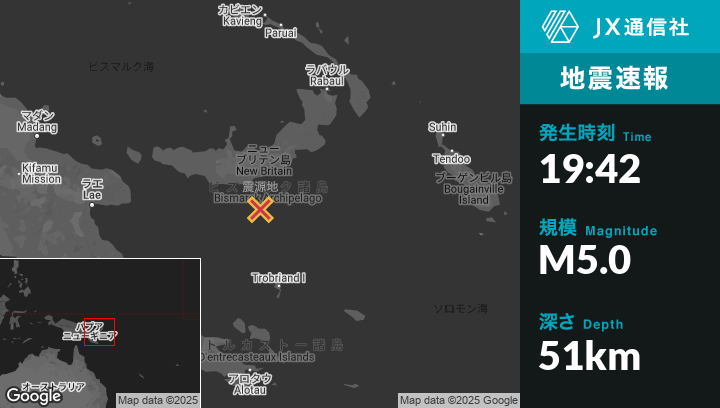 | 震源地 | パプアニューギニアのKandrianから東南東137kmの地点 |