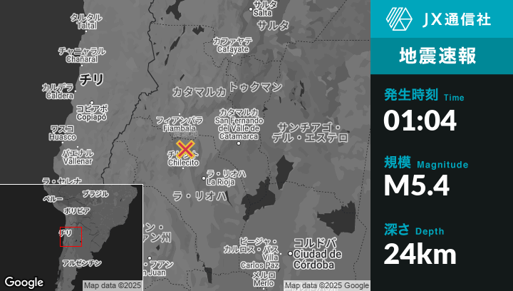 | 震源地 | アルゼンチンのTinogastaから南南東54kmの地点 |
