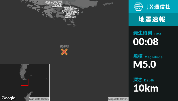 | 震源地 | アルゼンチンのUshuaiaから南256kmの地点 |