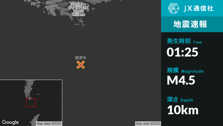 5月03日 01:25頃、アルゼンチンのUshuaiaから南288kmの地点でM4.5の地震がありました。