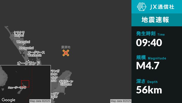 5月04日 09:40頃、ニュージーランドのHicks Bayから北154kmの地点でM4.7の地震がありました。