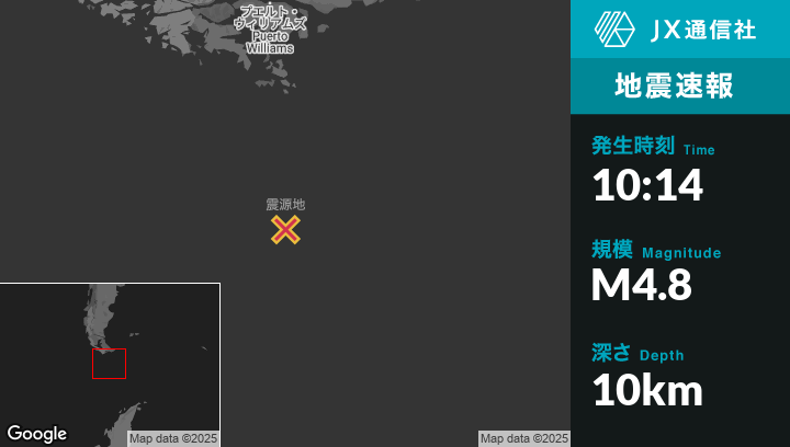 5月04日 10:14頃、アルゼンチンのUshuaiaから南南東294kmの地点でM4.8の地震がありました。