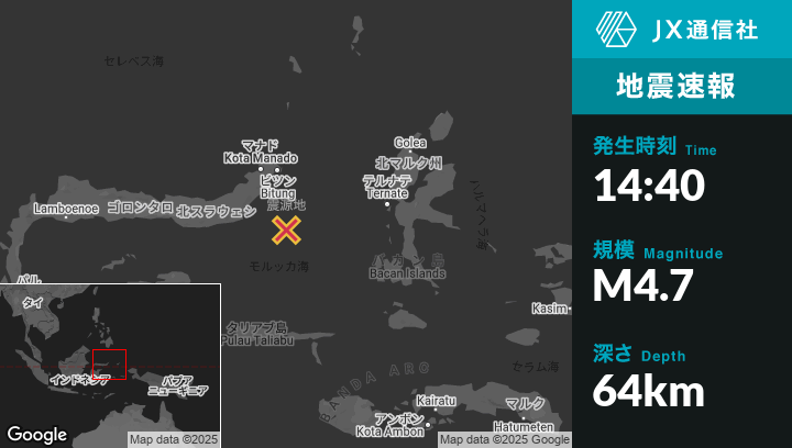 | 震源地 | インドネシアのModisiから東102kmの地点 |