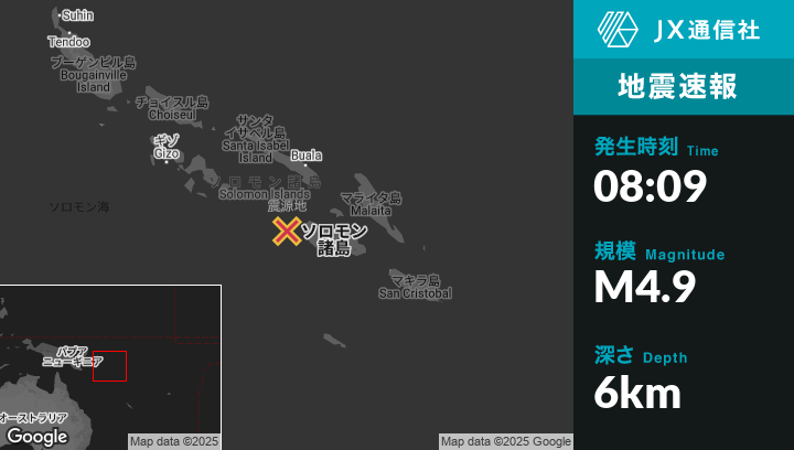 5月08日 08:09頃、ソロモン諸島のMalangoから北西66kmの地点でM4.9の地震がありました。