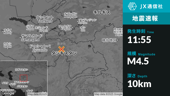 5月08日 11:55頃、タジキスタンのRashtから東南東39kmの地点でM4.5の地震がありました。