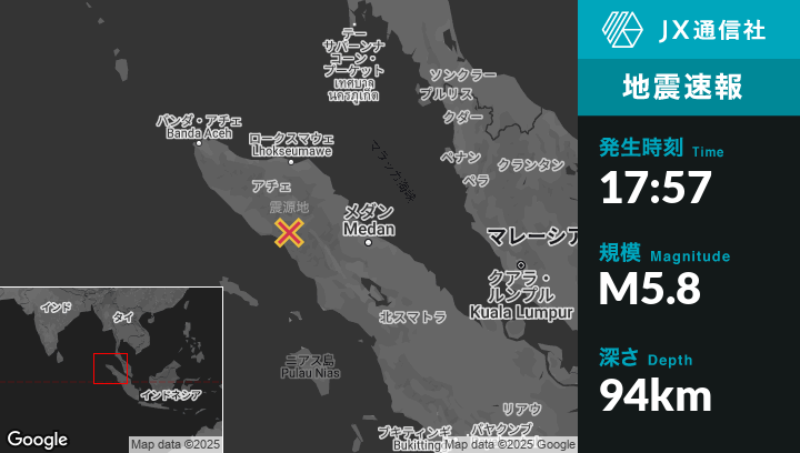 5月11日 17:57頃、インドネシアのBlangpidieから東北東33kmの地点でM5.8の地震がありました。
