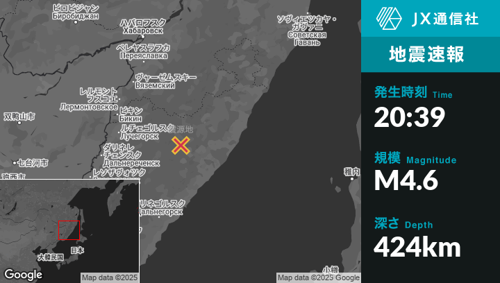 5月11日 20:39頃、ロシアのVostokから南東39kmの地点でM4.6の地震がありました。