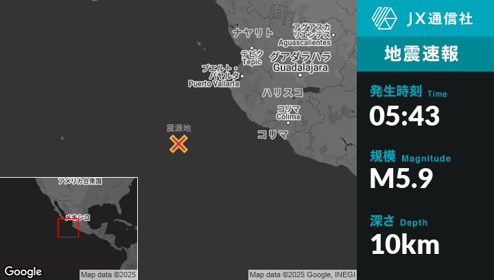 5月14日 05:43頃、メキシコのLa Cruz de Loretoから南西235kmの地点でM5.9の地震がありました。