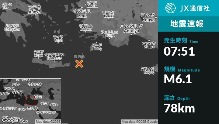 5月14日 07:51頃、ギリシャのFryから南15kmの地点でM6.1の地震がありました。