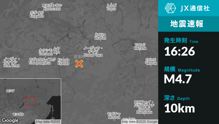 5月18日 16:26頃、ロシアのKuandaから東南東74kmの地点でM4.7の地震がありました。