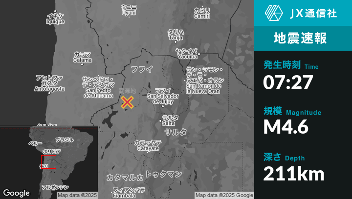 | 震源地 | アルゼンチンのSan Antonio de los Cobresから西北西68kmの地点 |
