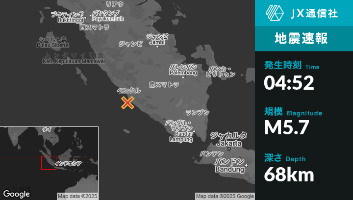 | 震源地 | インドネシアのBengkuluから南22kmの地点 |