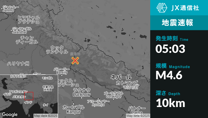 5月23日 05:03頃、ネパールのDadeldhurāから北西21kmの地点でM4.6の地震がありました。
