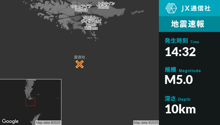 5月24日 14:32頃、アルゼンチンのUshuaiaから南223kmの地点でM5.0の地震がありました。