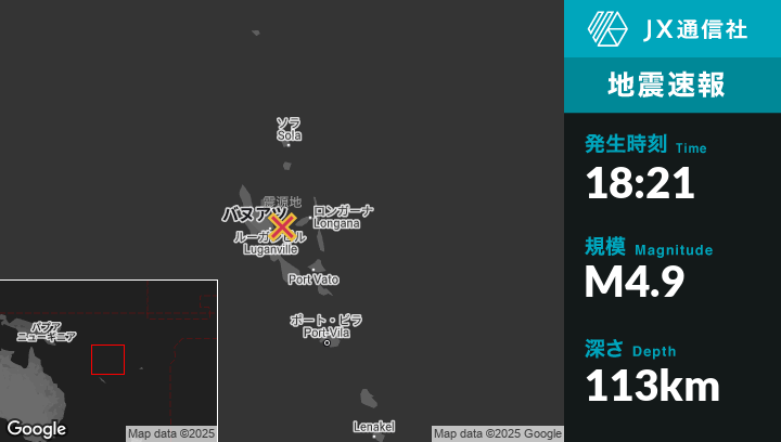 5月27日 18:21頃、バヌアツのLuganvilleから東北東32kmの地点でM4.9の地震がありました。