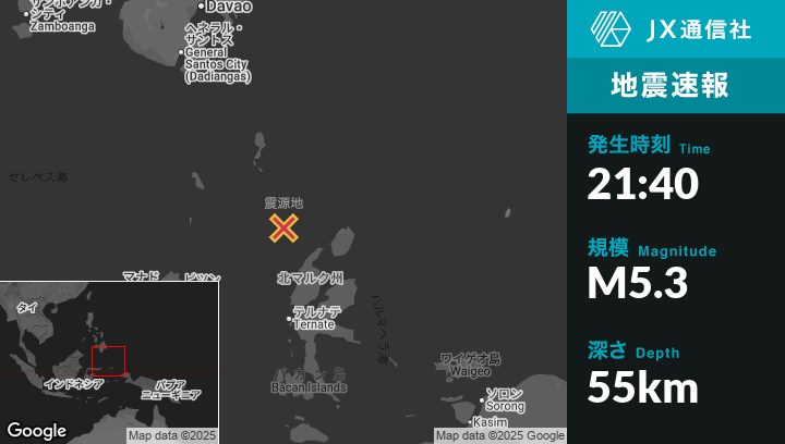 6月28日 21:40頃、インドネシアのTobeloから北西138kmの地点でM5.3の地震がありました。