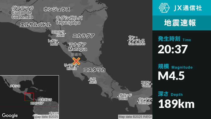 6月29日 20:37頃、ニカラグアのCárdenasから西南西6kmの地点でM4.5の地震がありました。
