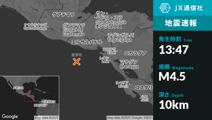 7月01日 13:47頃、エルサルバドルのLa Libertadから南117kmの地点でM4.5の地震がありました。