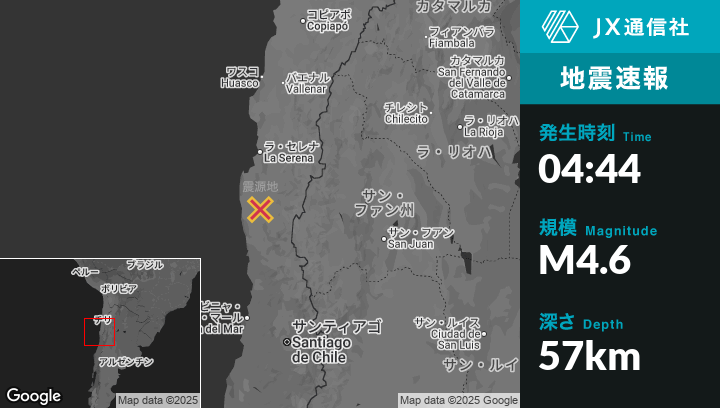 7月02日 04:44頃、チリのOvalleから南31kmの地点でM4.6の地震がありました。