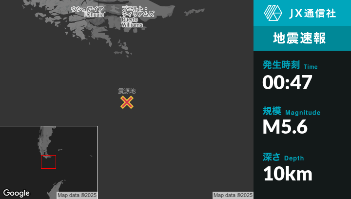 7月05日 00:47頃、アルゼンチンのUshuaiaから南南東253kmの地点でM5.6の地震がありました。